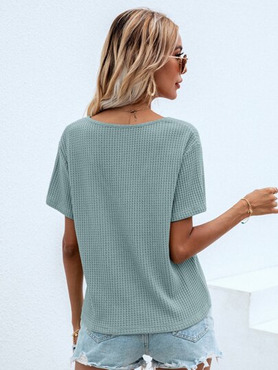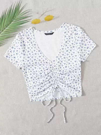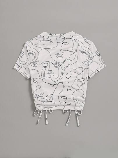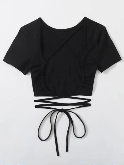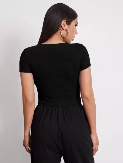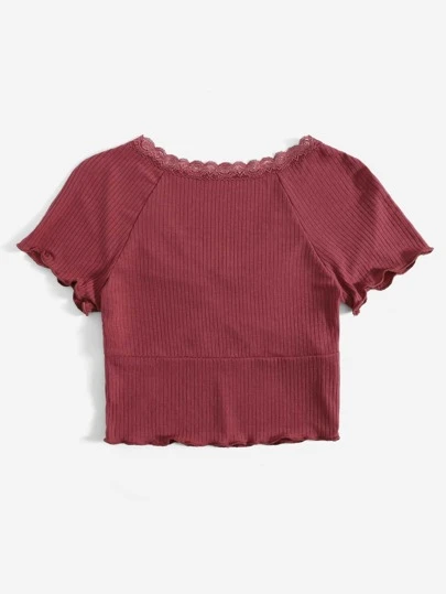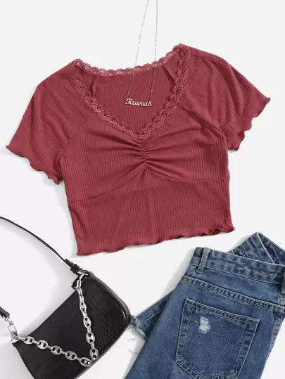 SHEIN Lace Trim Raglan Sleeve Ruched Rib-knit Crop Tee